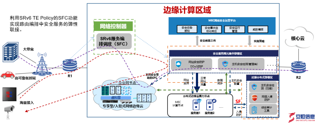 三是流量调度,通过控制网络流量,牵引或镜像流量至安全设备完成网络流量防护形成安全服务链。