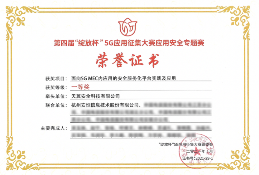 日前,由工业和信息化部组织的第四届“绽放杯”5G应用征集大赛应用安全专题赛结果出炉,经过层层筛选,天翼安全联合安恒信息共同打造《面向5G MEC内应用的安全服务化平台实践及应用》技术服务方案从323个参赛项目中脱颖而出,荣获一等奖。